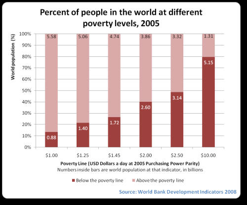 $1 a day: 21.1 Total number of people living on less than $1 a day: 1,089,000,000 Total percentage of the world's population living on less than $2 a day 52.9 Total number of people living on less than $2 per day 2,735,000,000 |