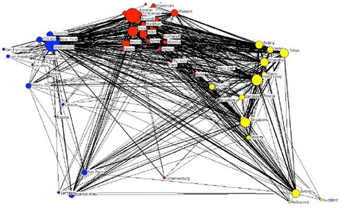 image shows inter-city linkages for 175 firms across the leading 50 world cities, 2011.
