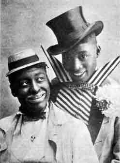 However, second, in some limited ways, vaudeville was racially progressive. The vaudeville commedian Joe Laurie Jr. supposedly said that talent has no color. And, it was certainly true that vaudeville was full of African American performers. It was by far the most promenent way that black performers moved into the mainstream. Bert Williams and George Walker (pictured left with Williams in blackface) were early successes in the 1890s. However, almost every African American performer from the first half of the 20th century started in vaudeville. These include Louis Armstrong, Fats Waller, Bill "Bojangles" Robinson, Duke Ellington, Pearl Bailey, Josephine Baker and many, many others.